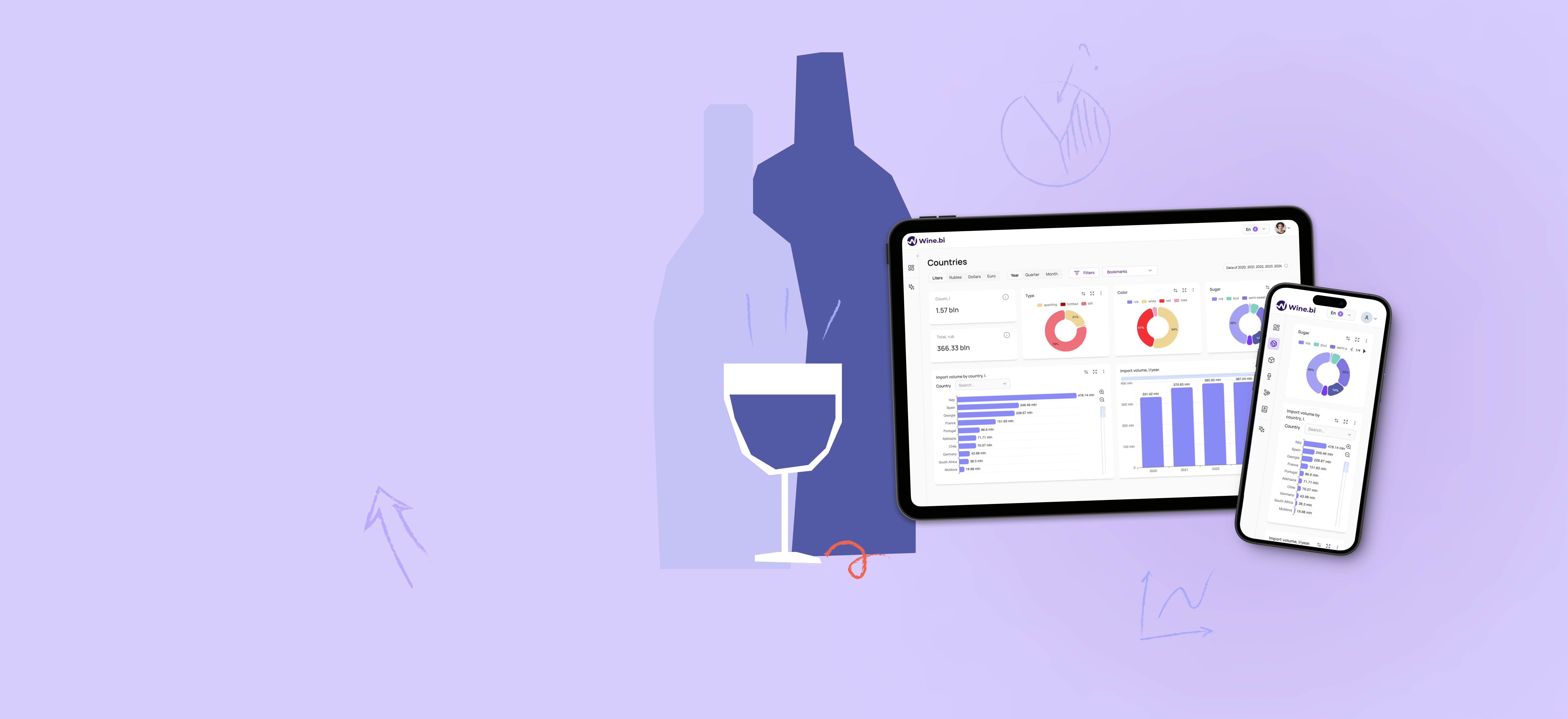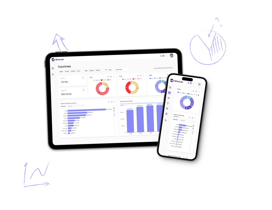 Analytical dashboards with customizable filters. An intuitive tool for tracking trends in the wine market, finding new growth areas and analyzing competitors.